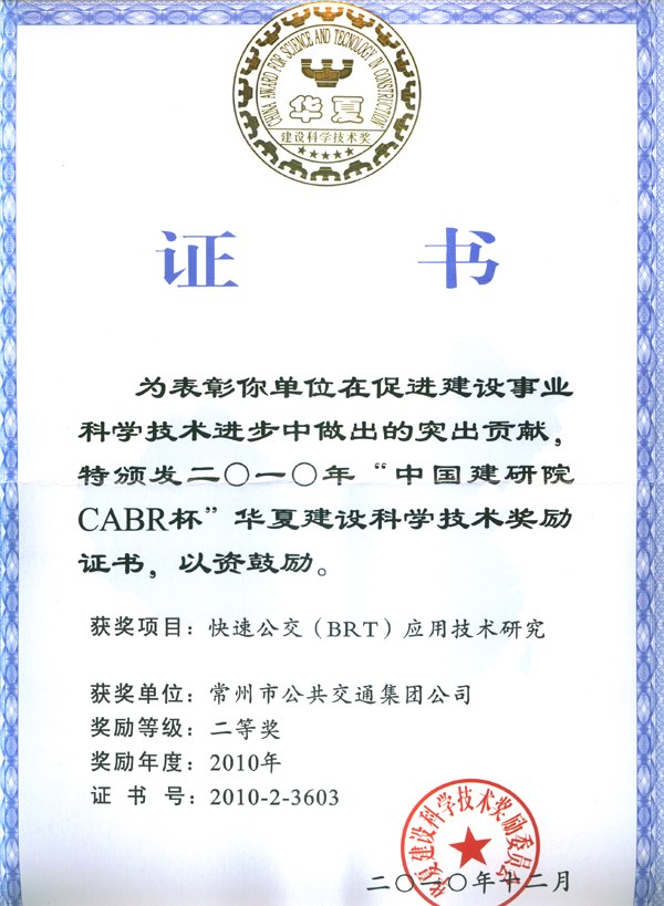 2010年“中國建研院CABR杯”華夏建設(shè)科學技術(shù)獎近日公布,經(jīng)華夏建設(shè)科學技術(shù)獎勵委員會審定,獲獎項目共86項,其中一等獎10項,二等獎26項,三等獎50項。常州市公共交通集團公司與北京城建設(shè)計研究總院有限責任公司等單位合作研究的成果“快速公交(BRT)應(yīng)用技術(shù)研究”獲得二等獎。