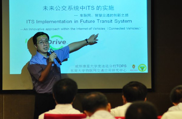圖為東南大學(xué)博導(dǎo)、國(guó)家“千人計(jì)劃”學(xué)者冉斌教授教授課程《公交系統(tǒng)中ITS的實(shí)施》