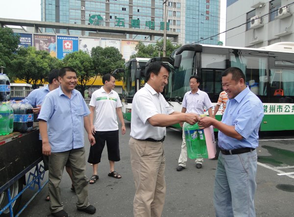 隨著今年“梅雨”季節(jié)的結(jié)束,我市進(jìn)入了一年中最熱的大伏天。7月26日下午,集團(tuán)公司領(lǐng)導(dǎo)分兩路,分別由黨委副書(shū)記袁杏娣和常務(wù)副總經(jīng)理孫魯明帶隊(duì),對(duì)奮戰(zhàn)在一線的職工進(jìn)行慰問(wèn)。領(lǐng)導(dǎo)們相繼來(lái)到江南商場(chǎng)、關(guān)河?xùn)|路、公交一公司、淹城、紅梅、火車(chē)站東廣場(chǎng)、火車(chē)站北廣場(chǎng)、龍虎塘等公交中心場(chǎng)站,深入到車(chē)隊(duì)對(duì)一線職工進(jìn)行高溫慰問(wèn),領(lǐng)導(dǎo)們察看了職工們的工作環(huán)境,仔細(xì)詢(xún)問(wèn)了各車(chē)隊(duì)的工作情況,檢查了解防暑降溫措施的落實(shí)情況,并向職工送上了毛巾、香皂、飲料等慰問(wèn)品。領(lǐng)導(dǎo)們代表公司對(duì)奮戰(zhàn)在高溫天氣的一線職工致以親切慰問(wèn),這使廣大職工既深受感動(dòng)又倍受鼓舞,大家紛紛表示將立足本職,做好工作,不斷提升服務(wù)質(zhì)量,努力確保行車(chē)安全。