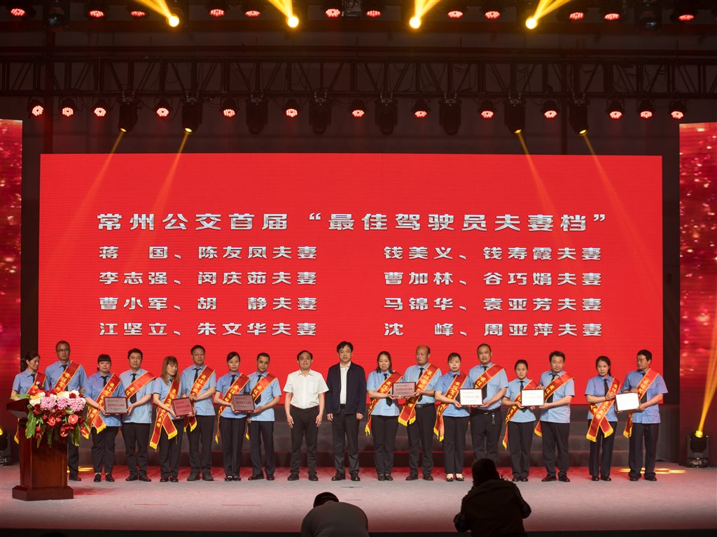 市總工會副主席于德江、市公安局副局長顧鋒、市交通運輸局副局長歐陽云、市交警支隊支隊長楊祎分別為常州公交首屆“金牌駕駛員”、“最佳駕駛員夫妻檔”頒獎。