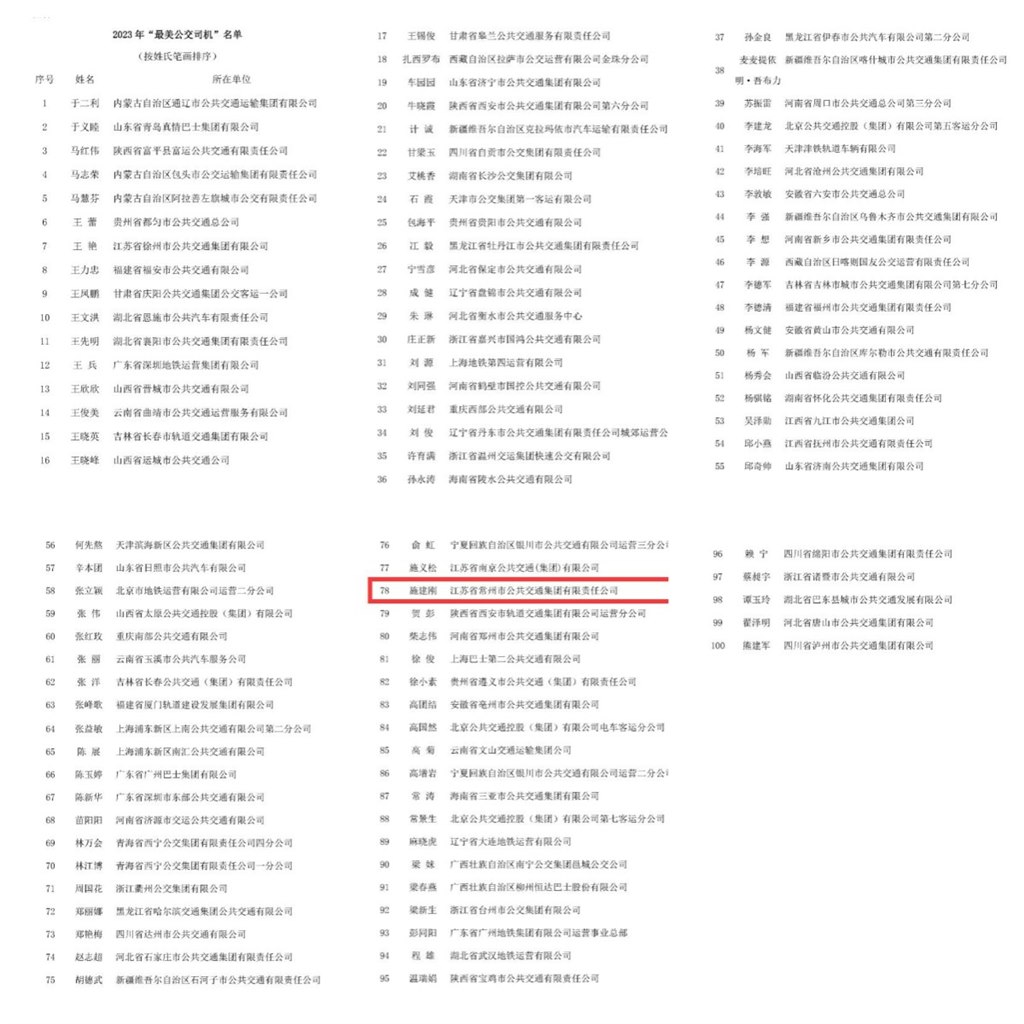 3月22日,由交通運(yùn)輸部、中華全國總工會聯(lián)合主辦的2023年全國“最美公交司機(jī)”評選結(jié)果出爐,江蘇省“工人先鋒號”、常州公交BRT 1號線班長、駕駛員施建剛榮獲“最美公交司機(jī)”稱號。據(jù)了解,本次評選活動經(jīng)履行有關(guān)推選程序,全國確定了100名個(gè)人為2023年“最美公交司機(jī)”,江蘇僅有3人上榜。